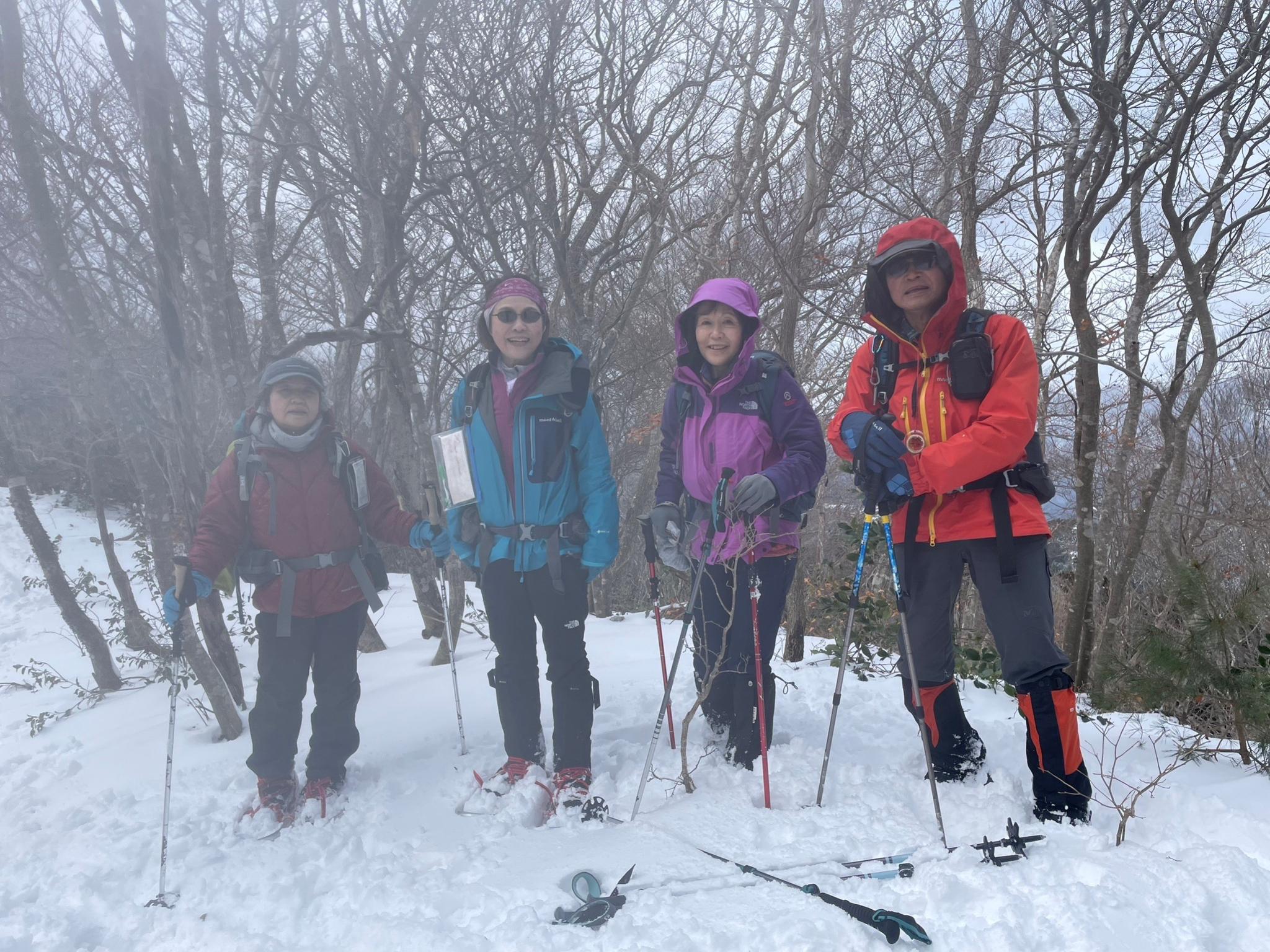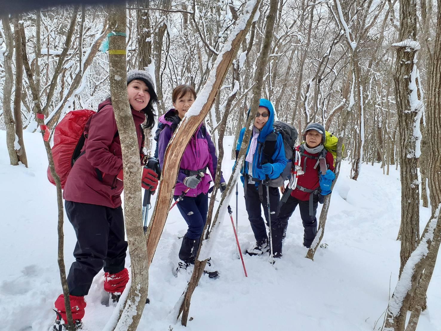 この日の登山道は新雪に覆われ、踏み跡の無いルートを気持ちよく登りました。涼峠から滝山までのルートは放置された倒木が多く、ルートファインディングと4~5回の渡渉を繰り返して滝山山頂に到着。アイゼンは使用せず全員壺足。時折青空も見えて景色もそれなにに味わえました。下山はワカン未経験者3人は初のワカン体験、余程歩き易かったらしく、その早いこと別人みたいでした。5人様貸し切りの滝山で綺麗な新雪たっぷりの雪山歩きを堪能しました。