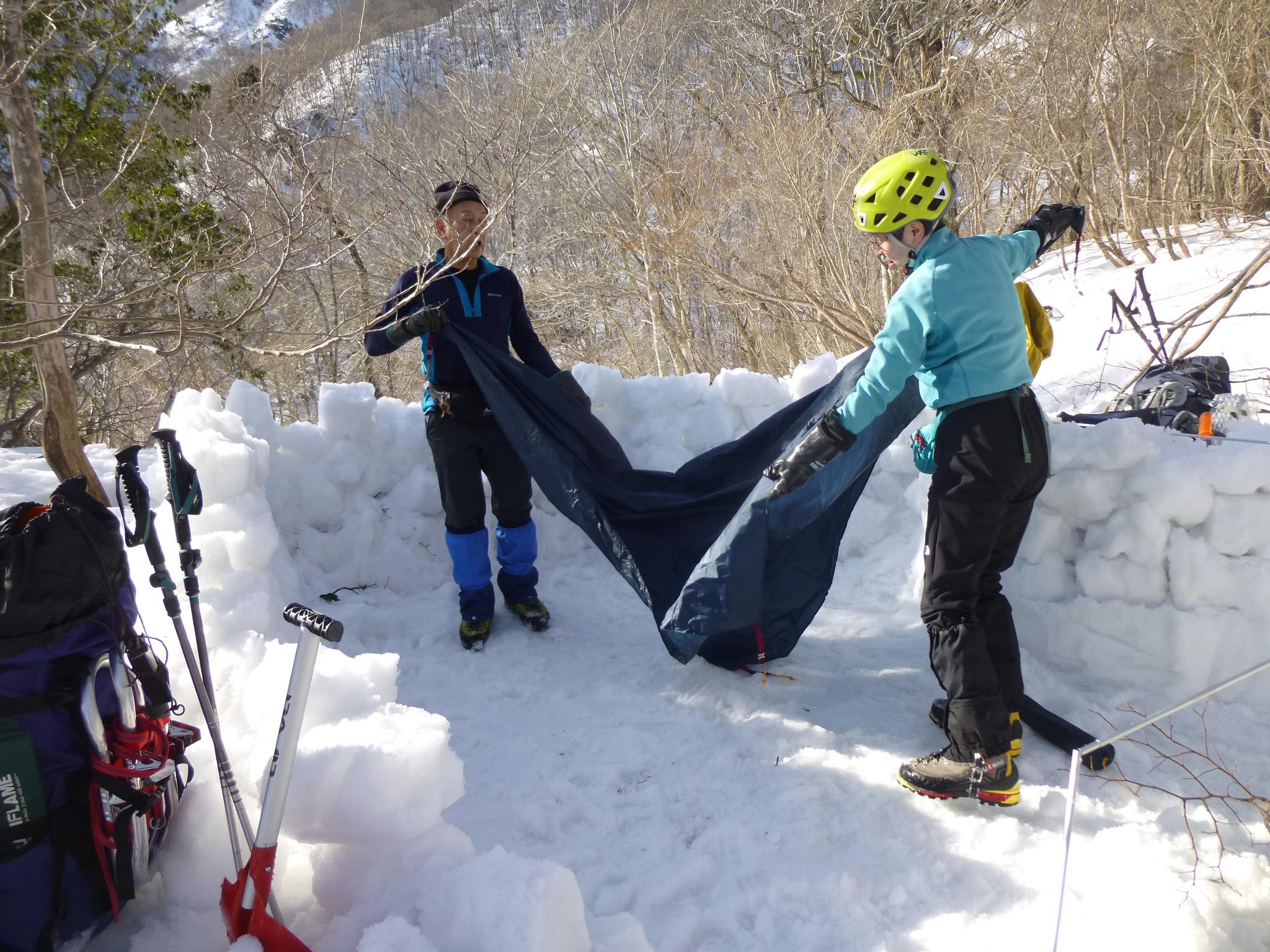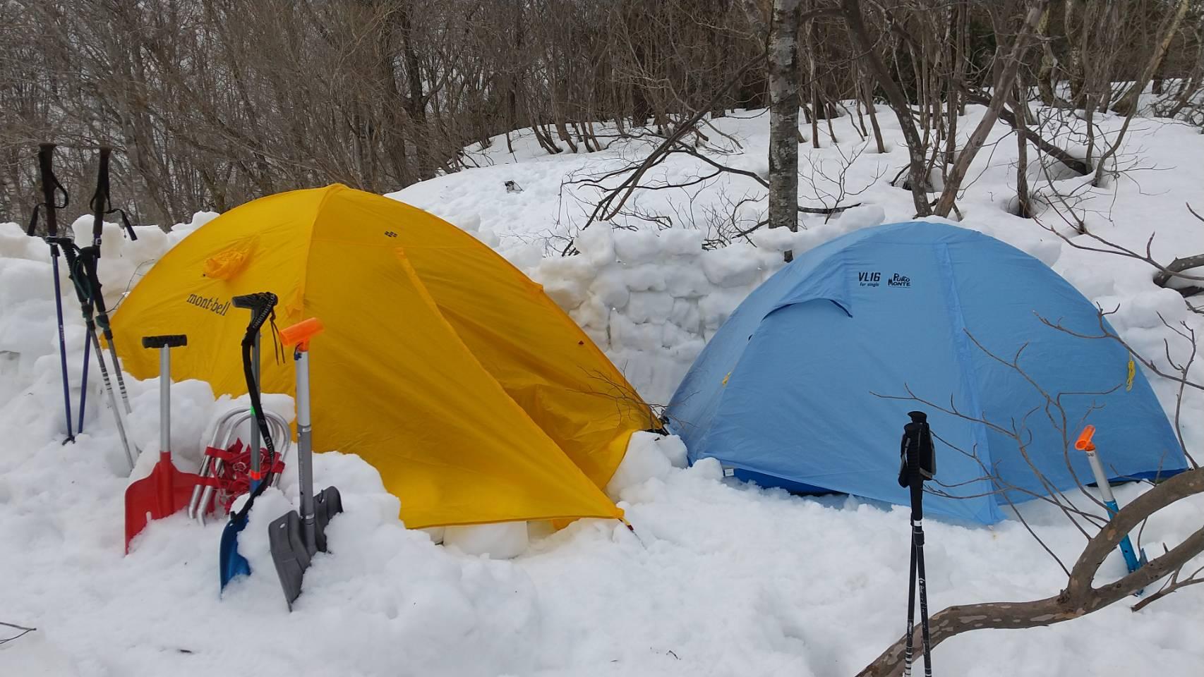温かく、風もなく晴天に恵まれました。マキノスキー場は昨日の雨で雪がとけてましたが、ブナの木平は幕営にはバッチリ!風向きを考え、ブロック塀を積み上げてテントを張りました。