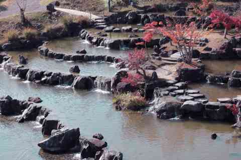 観月橋からの眺め 水景園と水景棚 飛び石伝いに対岸まで渡れます。