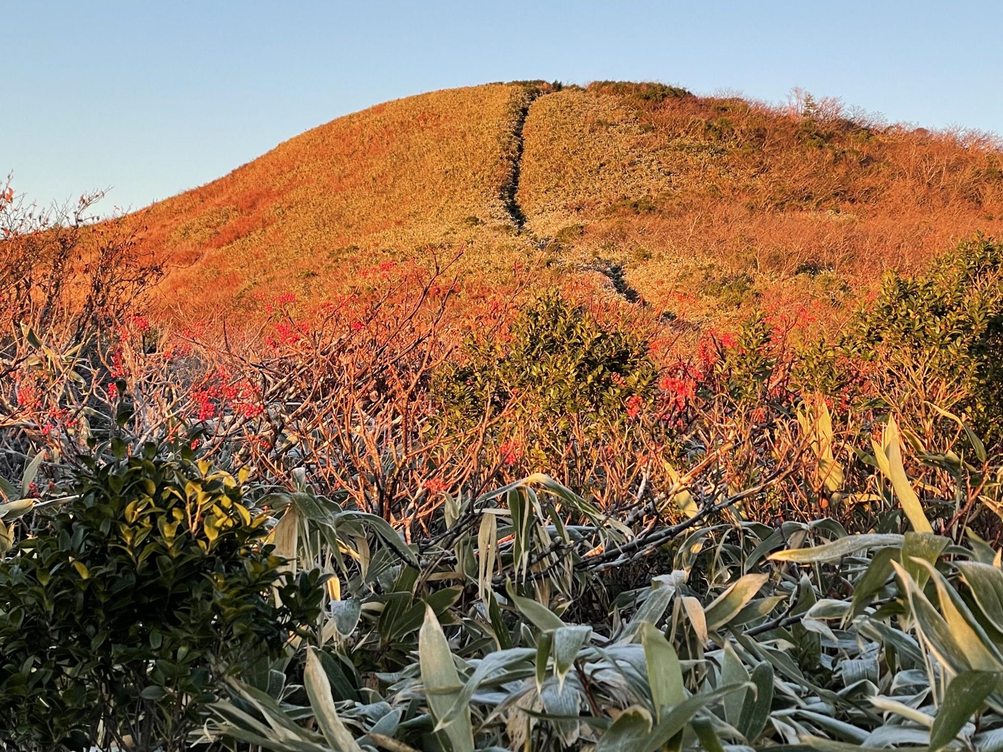朝の気温2度。避難小屋の中は6度。朝霜が降りて辺りは真っ白。朝日に映える赤兎はまさしく赤兎でした。