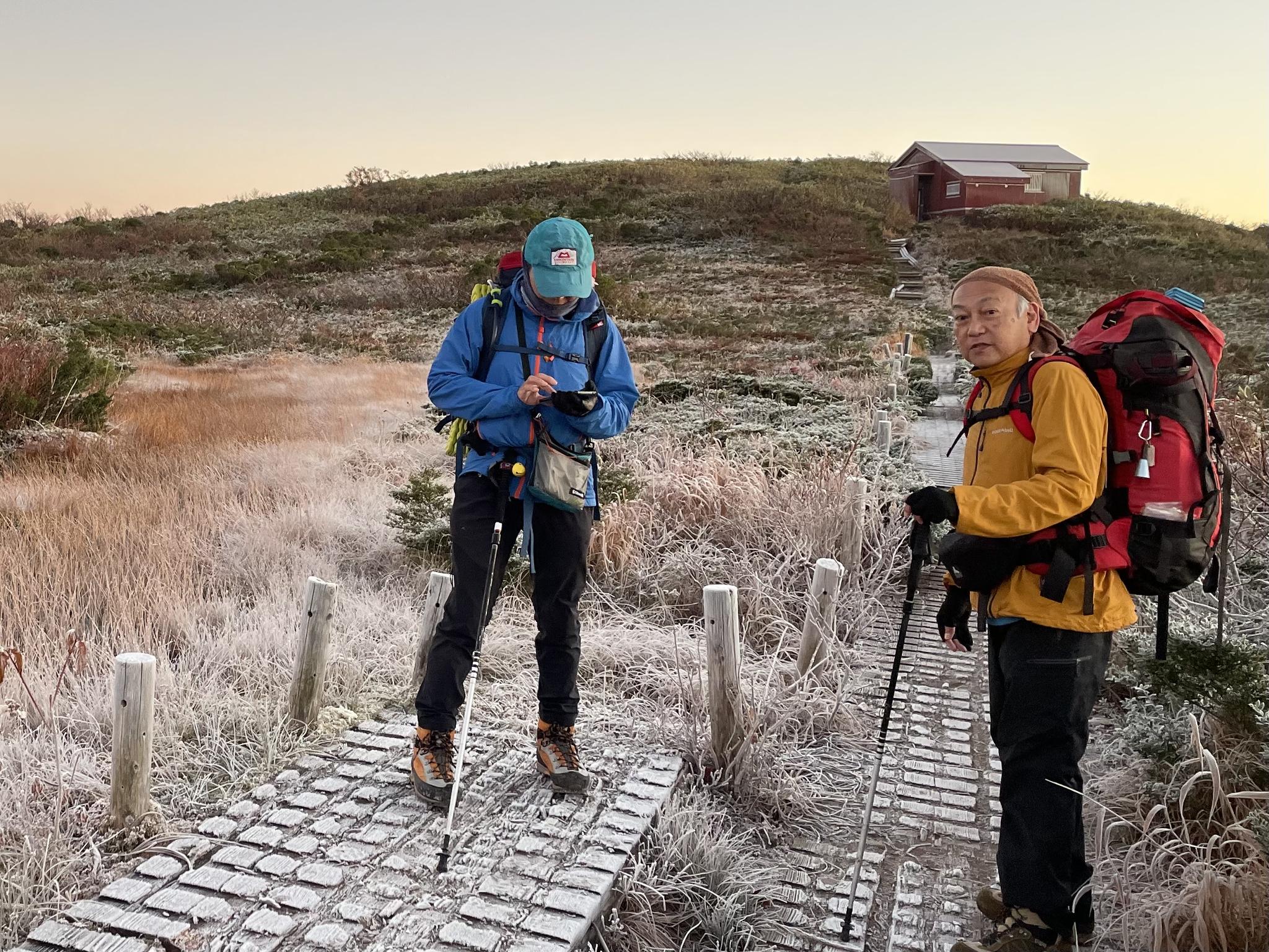 池塘の水を当てにしてたようだが、干上がっていた。霜の張りつく木道は滑る!雲一つない晴天に経ヶ岳に向けて期待が高まる!