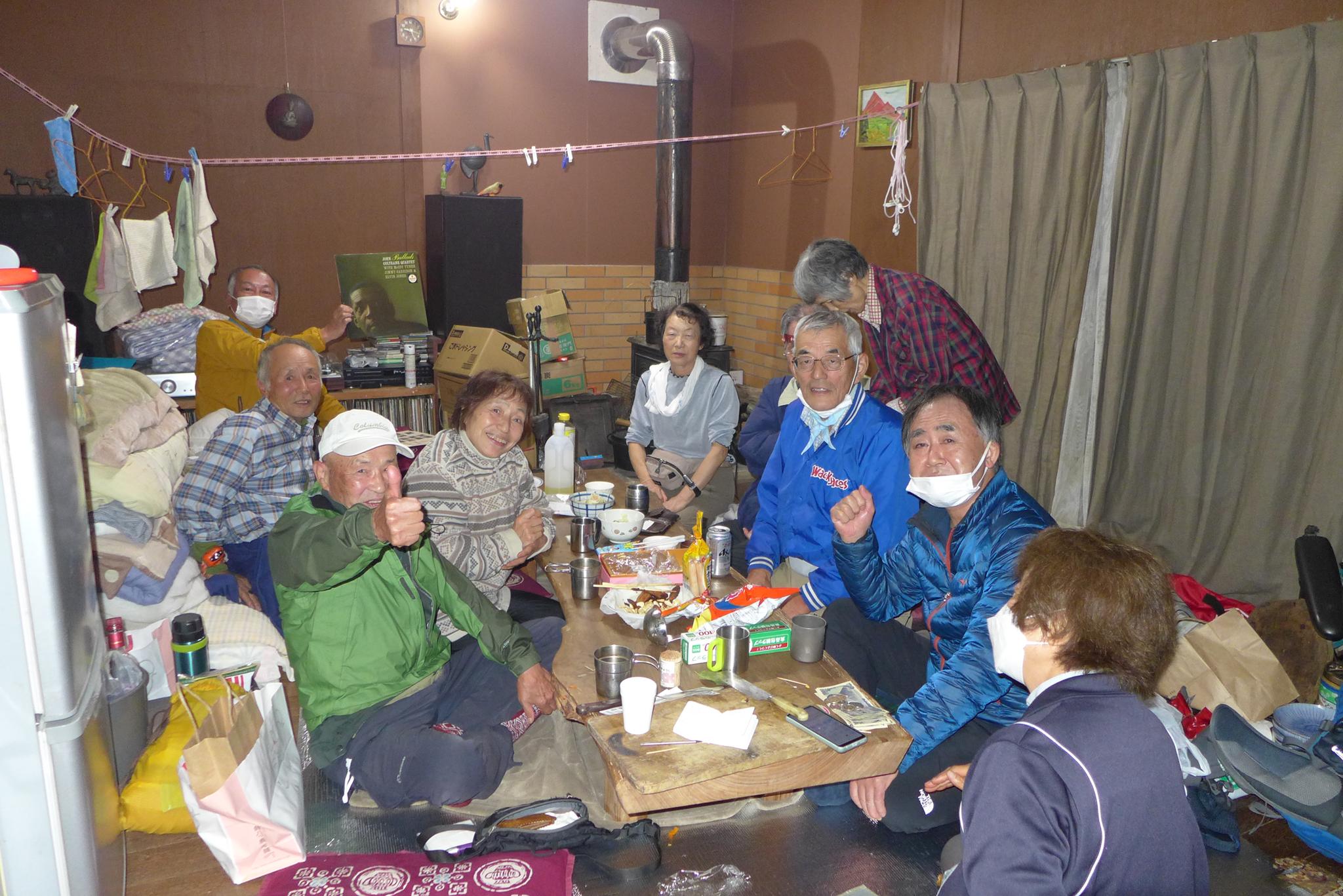 避難小屋に2泊しました。どちらも比較的綺麗で泊まり客は少なく、淀川小屋で7名、新高塚小屋で15人前後でした。ゆっくり横になれて熟睡しました。伏見の4人で車座になって食事など頂けました。