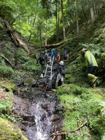 岩タバコ、夏エビネなどの分布観察の為、樹齢数百年のトチの木、巨岩のあるところ(定点観察地点)まで自性寺谷の沢を登る。