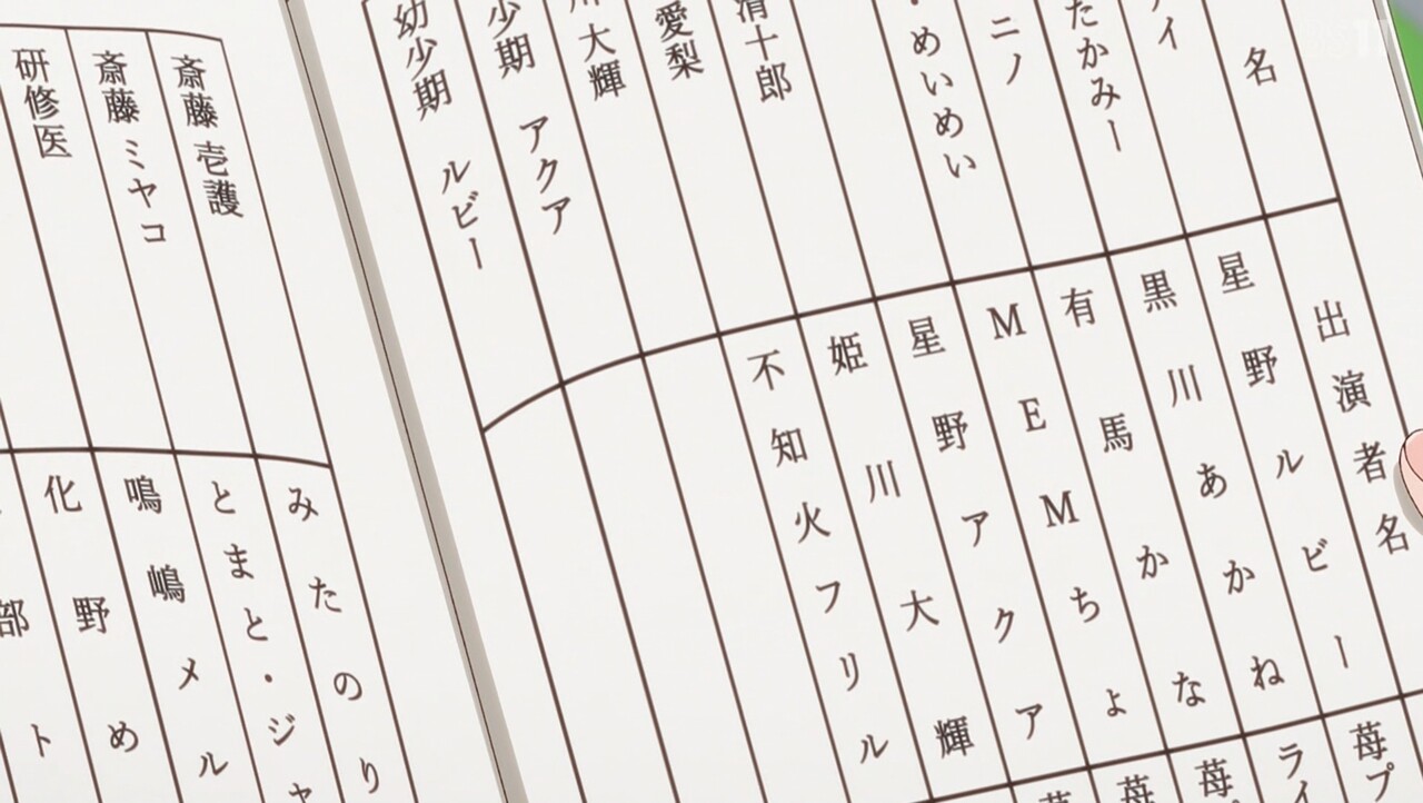 ちなみに脚本であかね、かな、MEMちょが役を当てている「たかみー」「ニノ」「めいめい」というのがアイのB小町メンバーな仲間なんでしょうね。