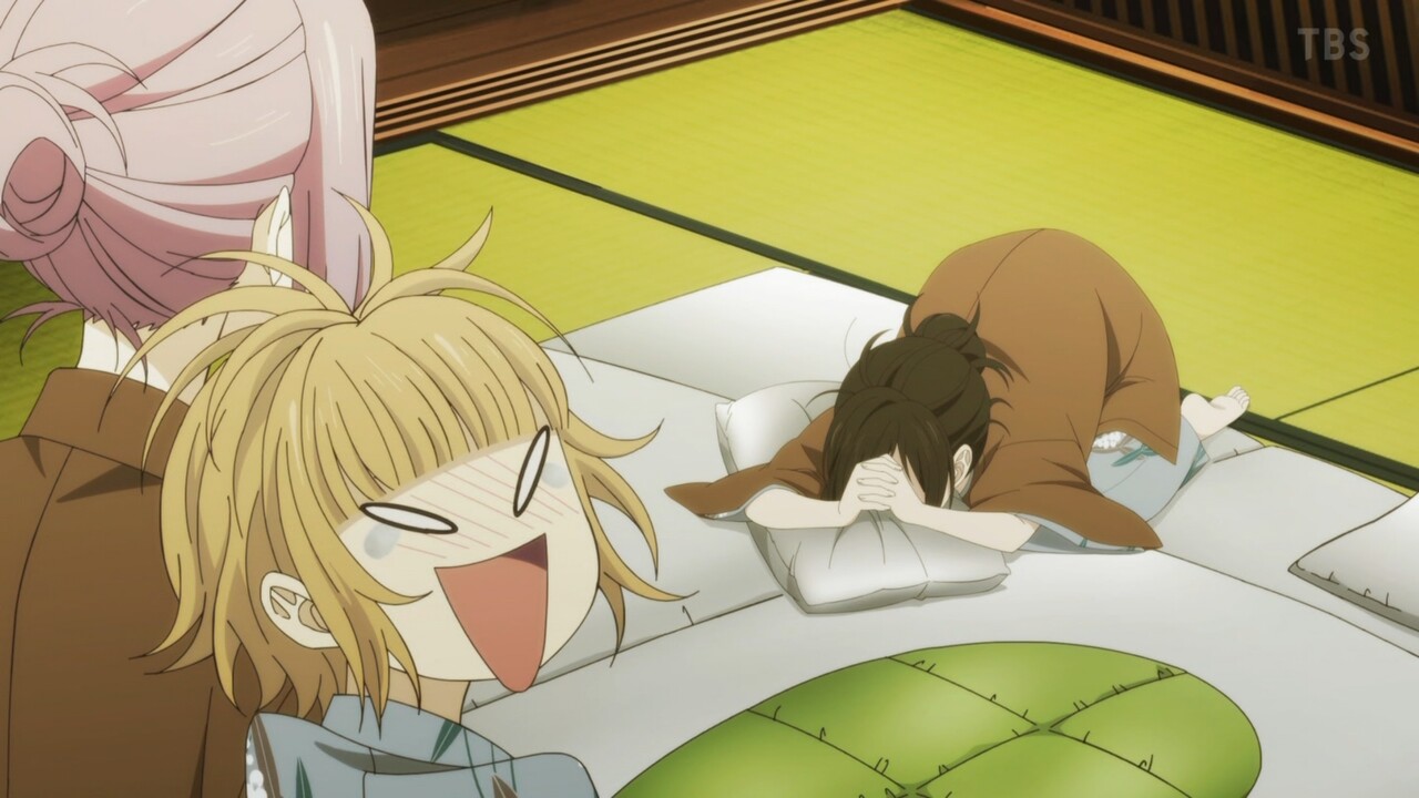 恋バナに興味津々の染谷さん。期せずして三重さんのやきもちを呼び起こして二人を接近させるお手伝いに。三重さんのさらなる接近が可笑しかったです。