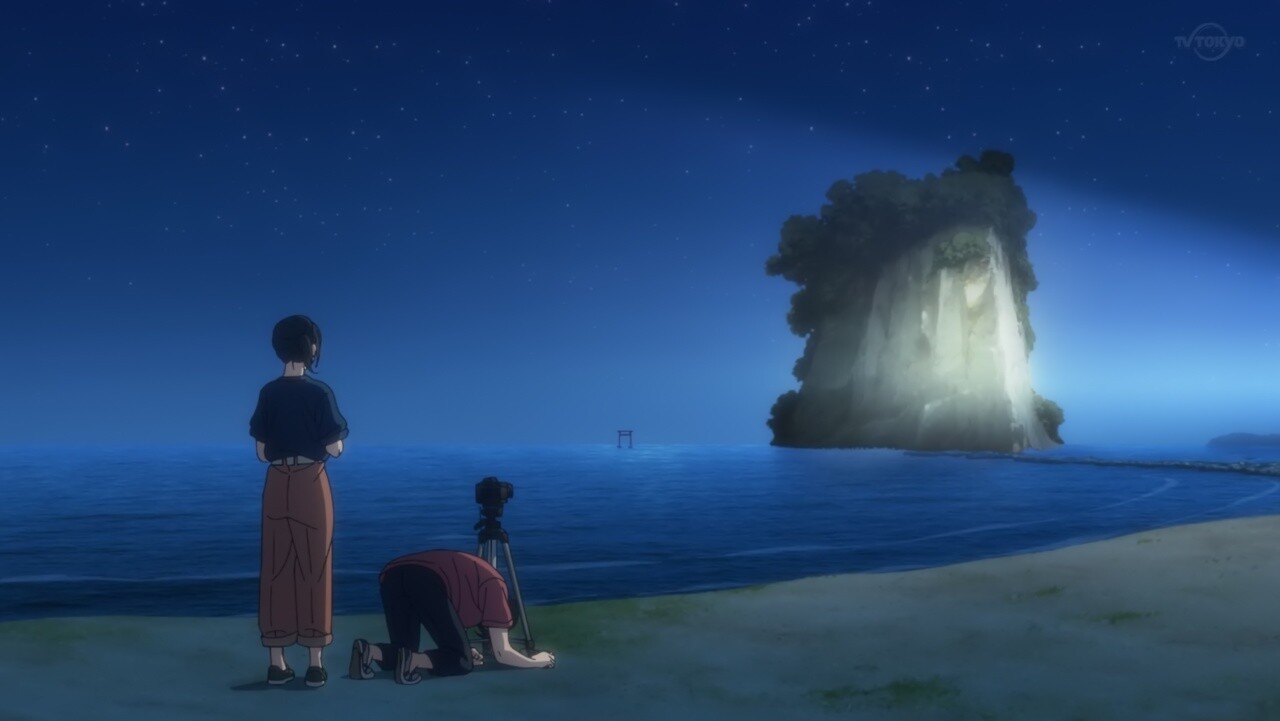 「君は放課後インソムニア」 第11話「夜明けの一番星」https://anicobin.ldblog.jp/archives/60594653.html >ちなみに、このエピソードを見て昔コロコロコミックで読んだ「がんばれ!ドンベ」というコミックでの運動会エピソードを思い起こしそうでした。 情報ありがとうございます。 >「だってそうだろう、お前らテストで0点取って拍手もらってうれしいかよお!」 こう言われると実に納得がいきますね。伊咲の気持ちもまさにそういうことだったのでしょうか。 合宿の撮影会が本格始動。最初の目的地の見附島の所在場所は珠洲市だそうで。他所の美津未には見慣れた景色なのかどうか。そこへ行くまでの道は人通りも少なく、やはり美津未が危機感を持つように過疎化が進んでいるようで。https://livedoor.blogimg.jp/anico_bin/imgs/b/a/ba562716.jpg 見附島付近の風景は美しく夜間の撮影には絶好に思えますが、ライトアップで出ばなをくじかれた形に。 こういう観光客相手のサービスも、地元振興のための努力の一環でしょうけれど、丸太たちには皮肉な巡りあわせで、23時終了で無ければ本当に脱力ものだったかと。https://livedoor.blogimg.jp/anico_bin/imgs/6/a/6ac42137.jpg その後も撮影は続きますがやはり宿泊先でのシーンが見ものでしょうか。ここに来て丸太が眠れない理由が明かされました。ファーストシーンで朝目覚めたら母親が家を出た後だった、というのが相当トラウマだったことでしょう。以降、明日を迎えるのが恐くなり無意識に今日を先延ばしするようになったしまったようですが。伊咲からのいきなりのキスがどう影響してくるものなのか。彼女との絆で明日への希望を確信できるようにって、不眠症も治ると良いのですが。