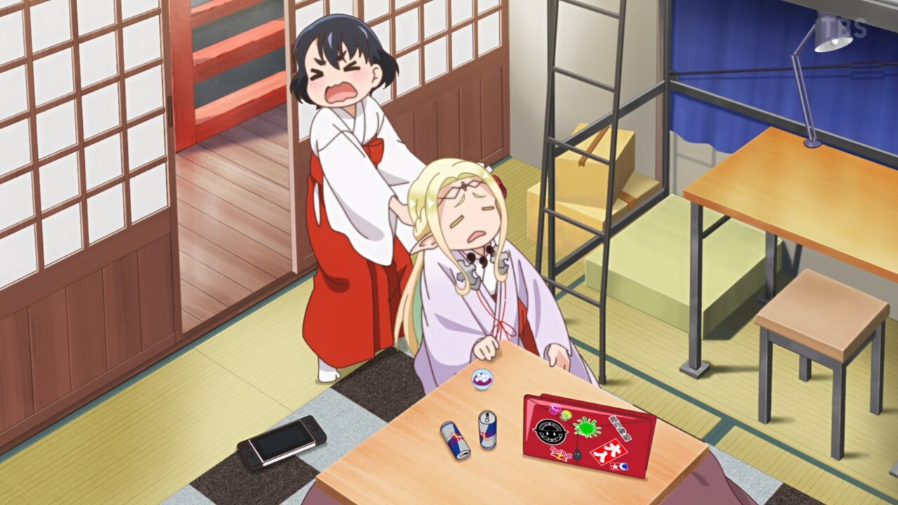 「エルフさんは痩せられない。」https://www.animatetimes.com/tag/details.php?id=5806#8 第1話「森の妖精」https://anicobin.ldblog.jp/archives/61630081.html ショートアニメ。 こちらの世界の味に魅了され過ぎて、バカ食いして太ったエルフのダイエットにつき合わされるマッサージ師の主人公。 料理に魅了されるところは「異世界食堂」のエルフと共通していますが、あちらは人間に負けない美味な料理を作ろうと頑張る方向に振れたというのに。https://anicobin.ldblog.jp/archives/51713447.html こちらはただひたすら食いまくり。主人公の直江もいくら仕事とはいえ、繰り返しデブになる絵留札さんにつき合わされてちょっと気の毒なような。 それにしても、絵留札さんの節制の無さを見ていると、他所のぐうたらな江戸前エルフはまだしも自制が利いていたのだな、と思わされます。もっともそれは、巫女の監視が厳しかったからかも知れませんけれど。https://livedoor.blogimg.jp/anico_bin/imgs/5/8/585f6fca.jpg (第1話より)