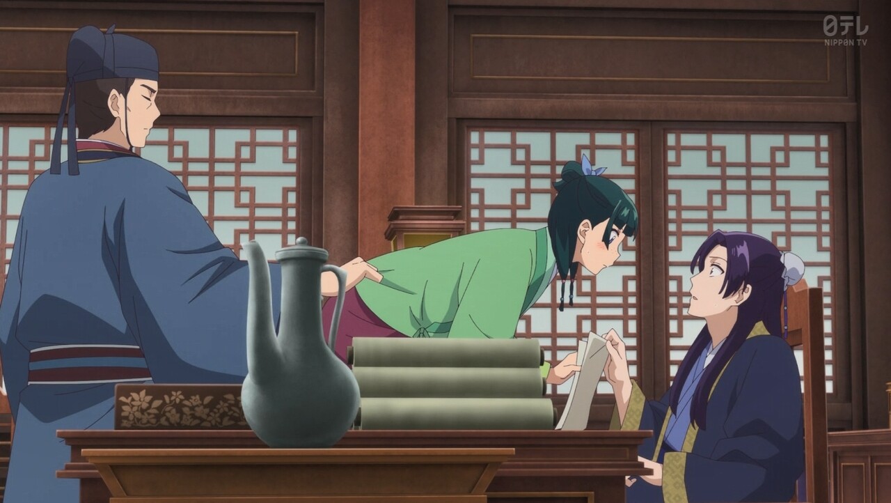 これまで出てきた点と点とが結び合わされて、必然のたくらみが見えてくる様は楽しかったです。そして、さらにマオマオに捜査を進めさせようとする壬氏がちらつかせたのが、牛黄という貴重な薬の材料で、マオマオの食いつき方がすごかったでしょうか。まるで他所の裏ボスが武術大会の優勝賞品を知ったときのような。前にも言いましたが、やっぱりこの二人似た者同士かと。