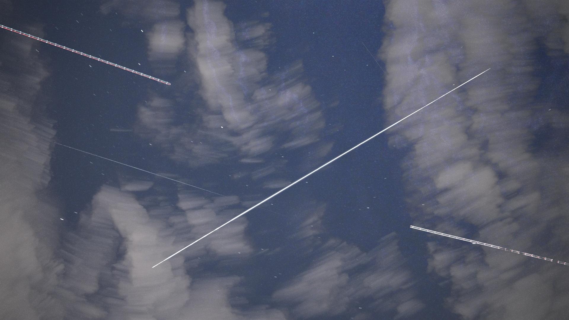 画像は、動画から重ね合わせました。右上から左下の太い軌跡がISSです。
