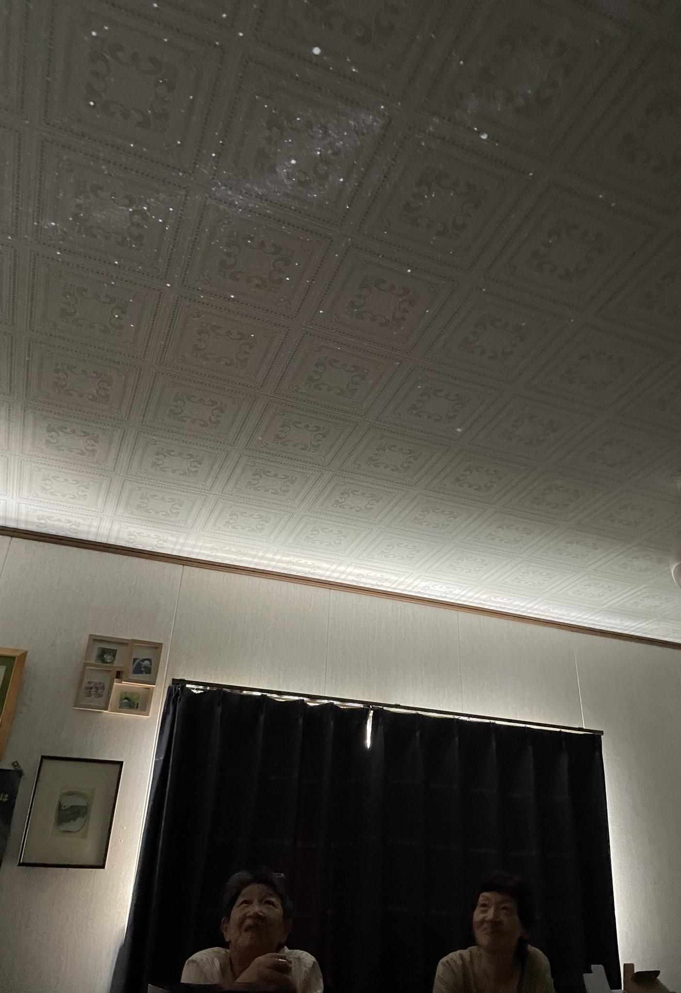 去年は手作り望遠鏡で高齢者さん達と、さやママ(ママ友)解説でスクリーンの月を観ました。今年もさやママ協力でホームスターの星空を参加者さん達と見上げました。日中、部屋が明るくてわかりづらいですが虫の声が流れる星空に癒されました。