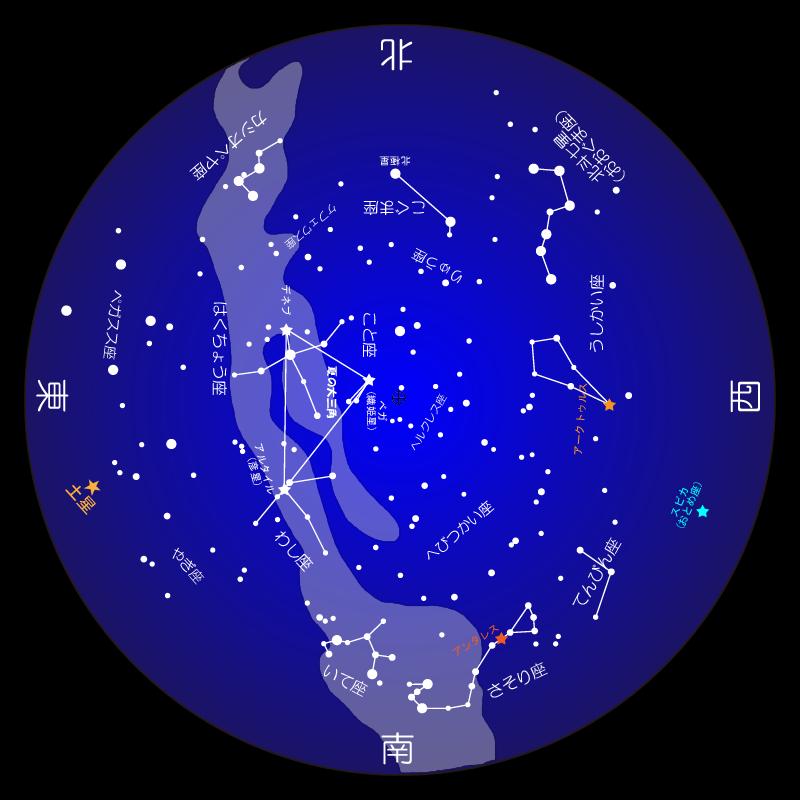 20時から21時ごろに見える星空の地図を付けますので、星を見る時の参考に。