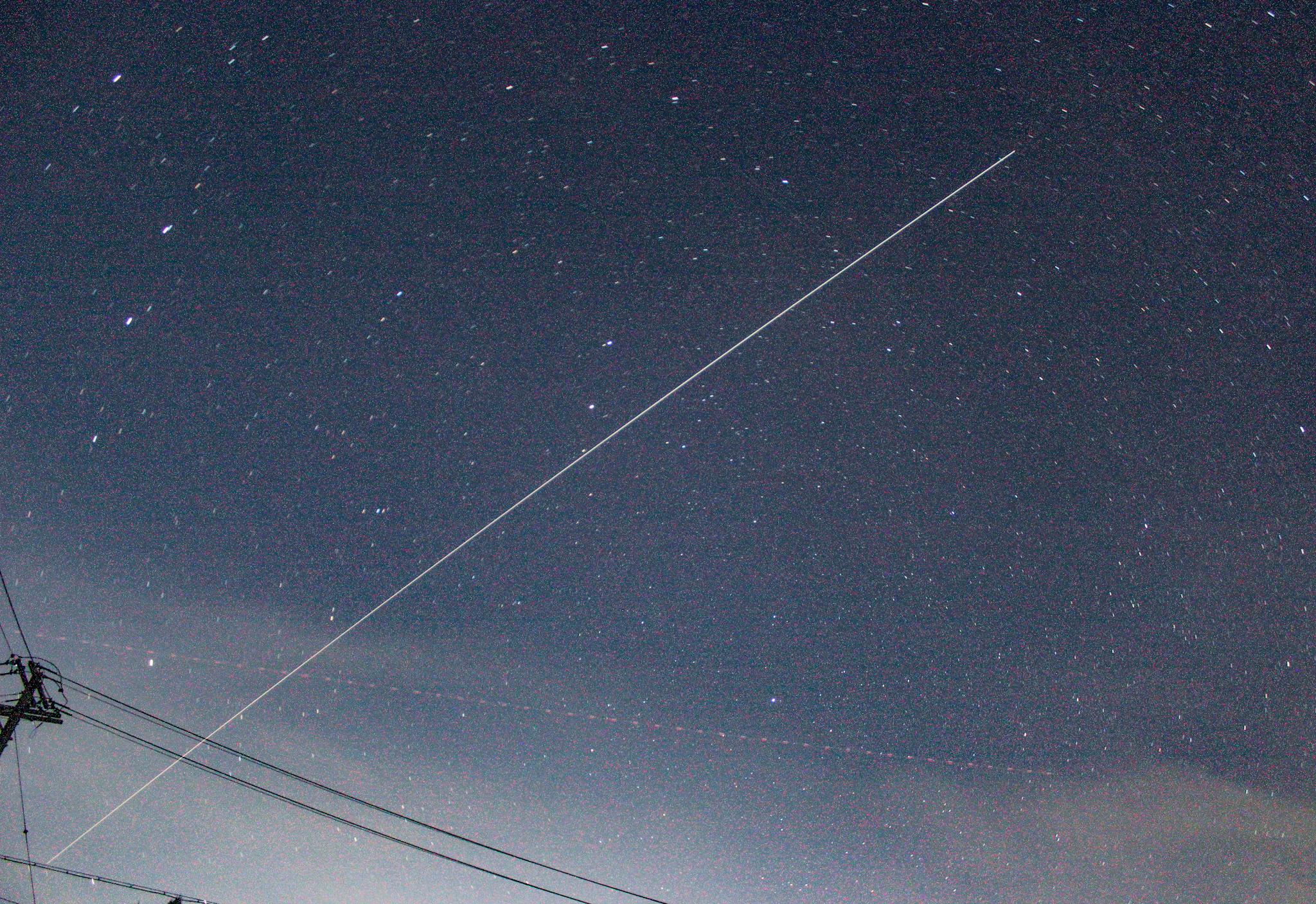 ISSと飛行機。見ているだけじゃ交差しないけれど、写真にすると…。1人で写真を撮っていますが、どこからともなく蚊たちが近づいてきてくれます。この季節に写真を撮るのは蚊との戦いでもありますね(笑)。