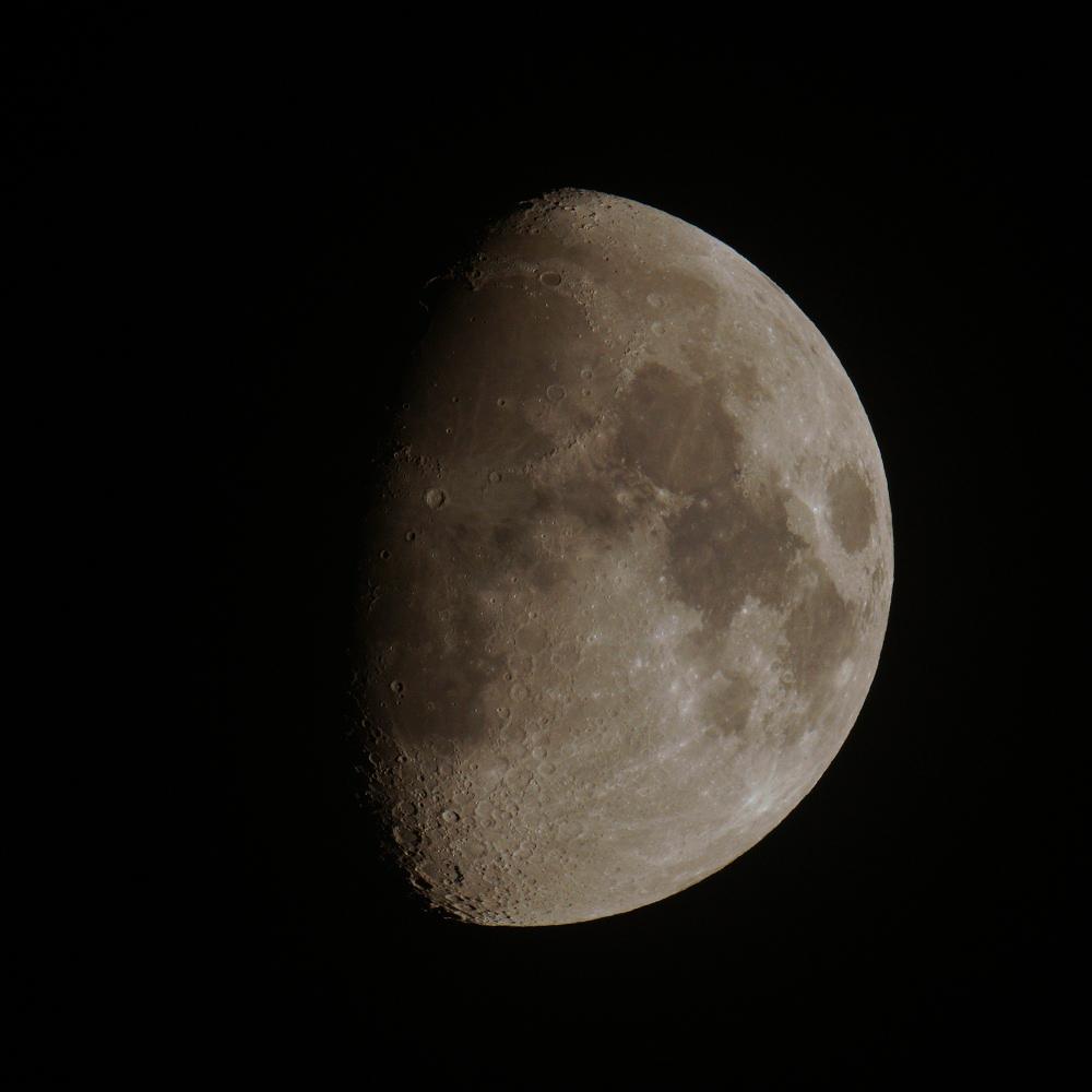 写真は5cm望遠鏡で撮影した今宵の月です。高度が低いので、だいぶ赤みがかって