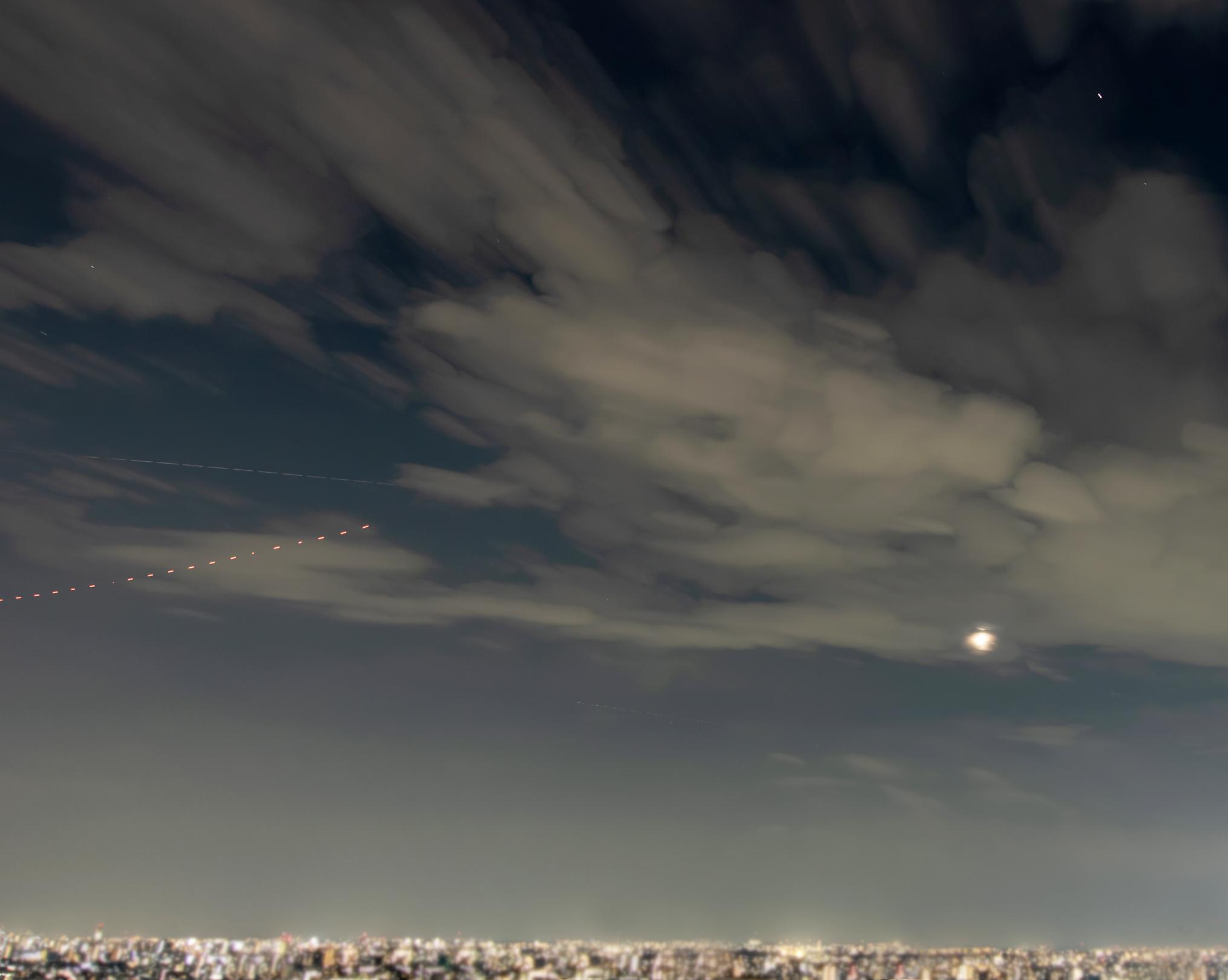飛行機の紅い軌跡とISSと流れる雲、動きのある素敵な画像をありがとうございます。