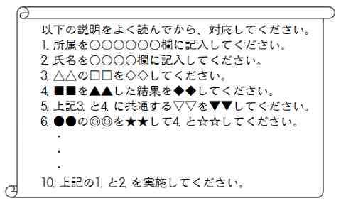 で、配布時には、指示内容を制限時間内で完遂することが求められ、制限時間はかなり短いものの最後まで読んで指示通りに対応するには十分な長さです。