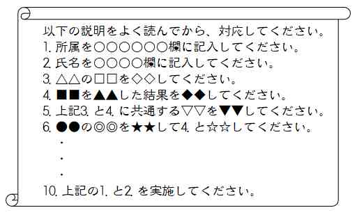 で、配布時には、指示内容を制限時間内で完遂することが求められ、制限時間はかなり短いものの最後まで読んで指示通りに対応するには十分な長さです。