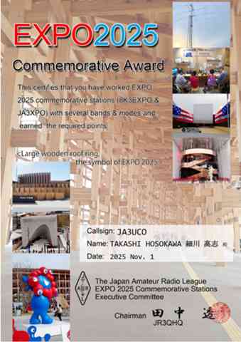期間中 大阪・関西万国博覧会記念局8K3EXPOおよびJA3XPOがボランティアによって運用されました。アマチュア無線館にも多くの来場者があり、ボランティアスタッフはてんてこ舞いだったと聴いております。HAMの世界を少しで覗いて戴けた成果はあったようです。開幕当初は、オールドマスゴミによるネガティブキャンペーンにさらされ続けました。伊集院某に至っては、「地方の遊園地ごときには、金を貰っても行かない」とも言っていました。が、真実を伝え良識あるSNS等により人気がうなぎ登りとなりました。