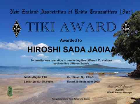ニュージーランドの無線連盟(NZART)のアワード、TIKI AWARDです。