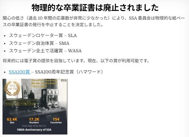 SSA(Swedenアマチュア無線連盟)が発行するアワードが発行中止というニュースを見つけました。