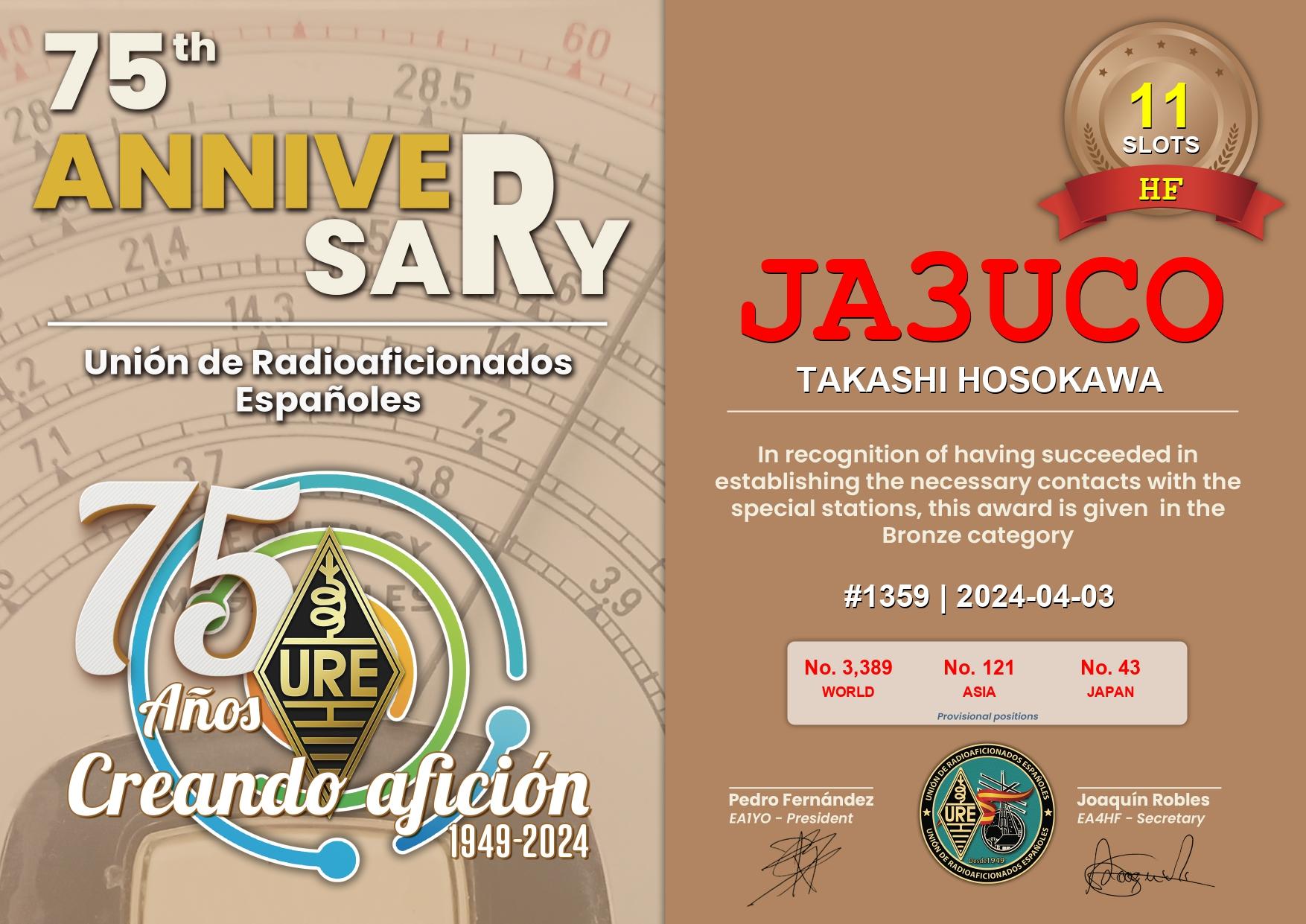 4月1日からスペインの連盟 UREの設立75周年を記念して【AO75**】というプリフックスの局がALL BAND /MODEで運用しています。