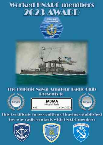 Hellenic Naval Amateur Radio Club(ギリシャ海軍アマチュア無線クラブ)から発行されているHNARC AWARD 2023を入手しました。ルールは今年中にメンバー55局の中から5・10・20局とQSO、バンド・モード・QSO日が異なればそれぞれ有効でQSLは不要です。
