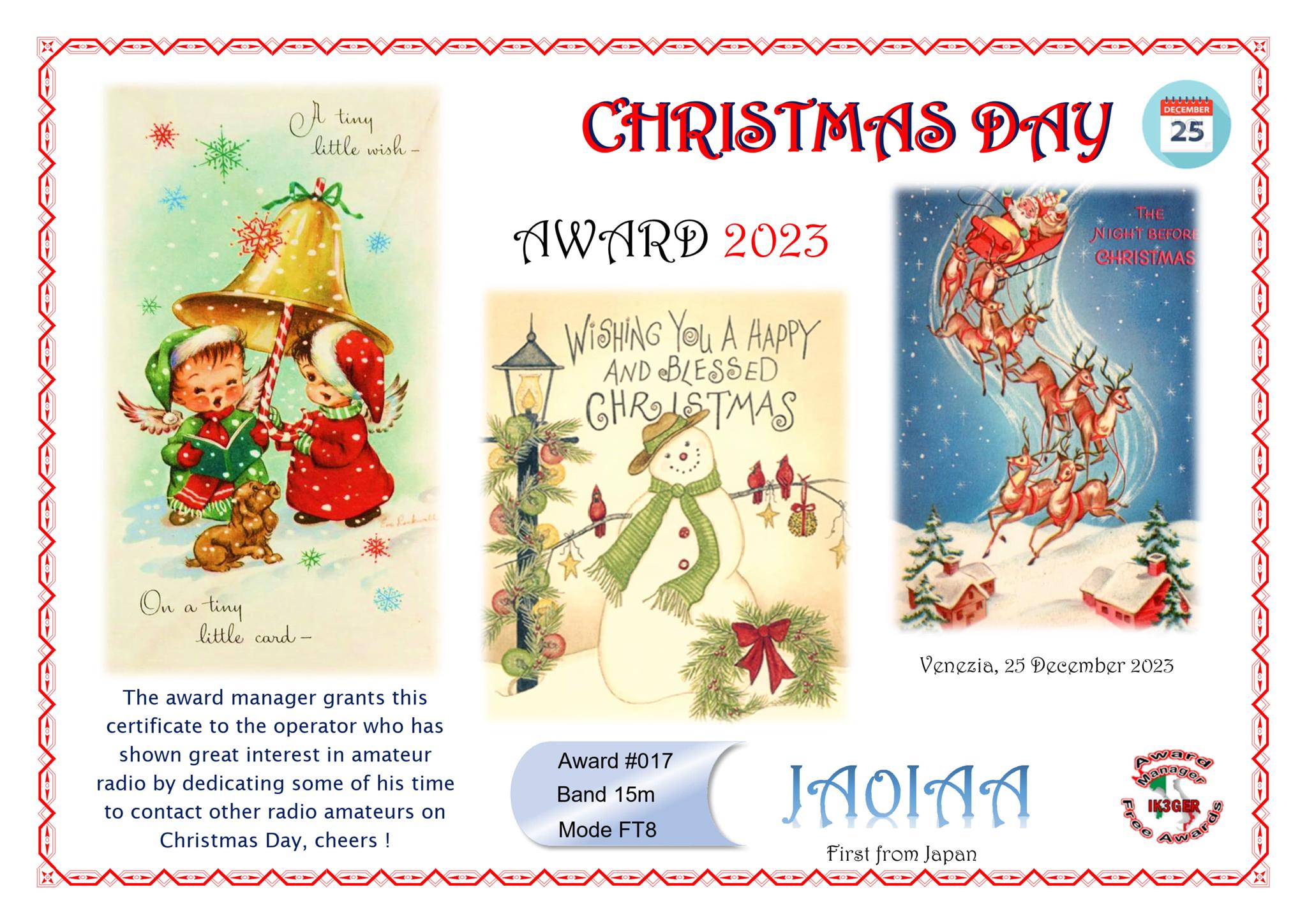 “CHRISTMAS DAY 2023": for this award no QSL is necessary, just make 10 QSO with different callsigns, and send in the application to me. QSO may be made all with the same country ( Japan ).