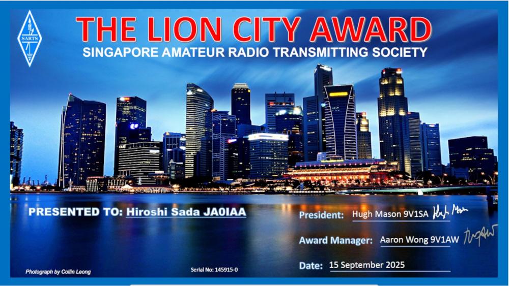 シンガポールの無線連盟SARTSの標記のアワード、まだ発行されていました。Webサイトのトップページの一部に掲載されており、20年以上前に申請・入手していましたが、デザインが変わっていたので改めて申請しました。ルールの記述はアバウト、マネージャーの9V1AW Aaronへメールし確認しました。