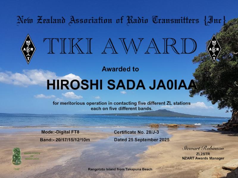 ニュージーランドの無線連盟(NZART)のアワード、TIKI AWARDです。