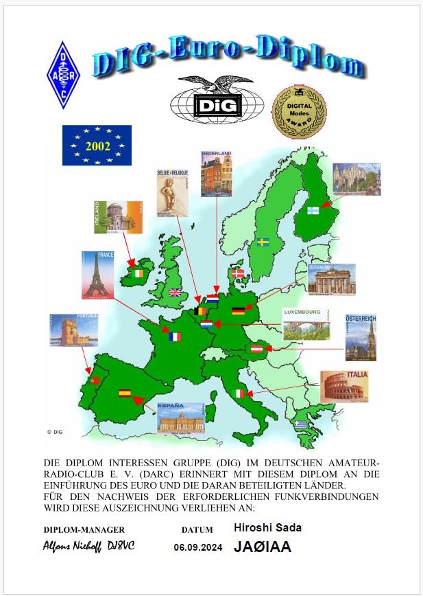 ドイツのアワードグループDIGのアワードで、EURO発足当時の12か国(アワードで写真のある11か国+ギリシャSV)のQSLを得ます。1局1ポイント・首都は2ポイントで77ポイント、各国最低1ポイントは必要です。