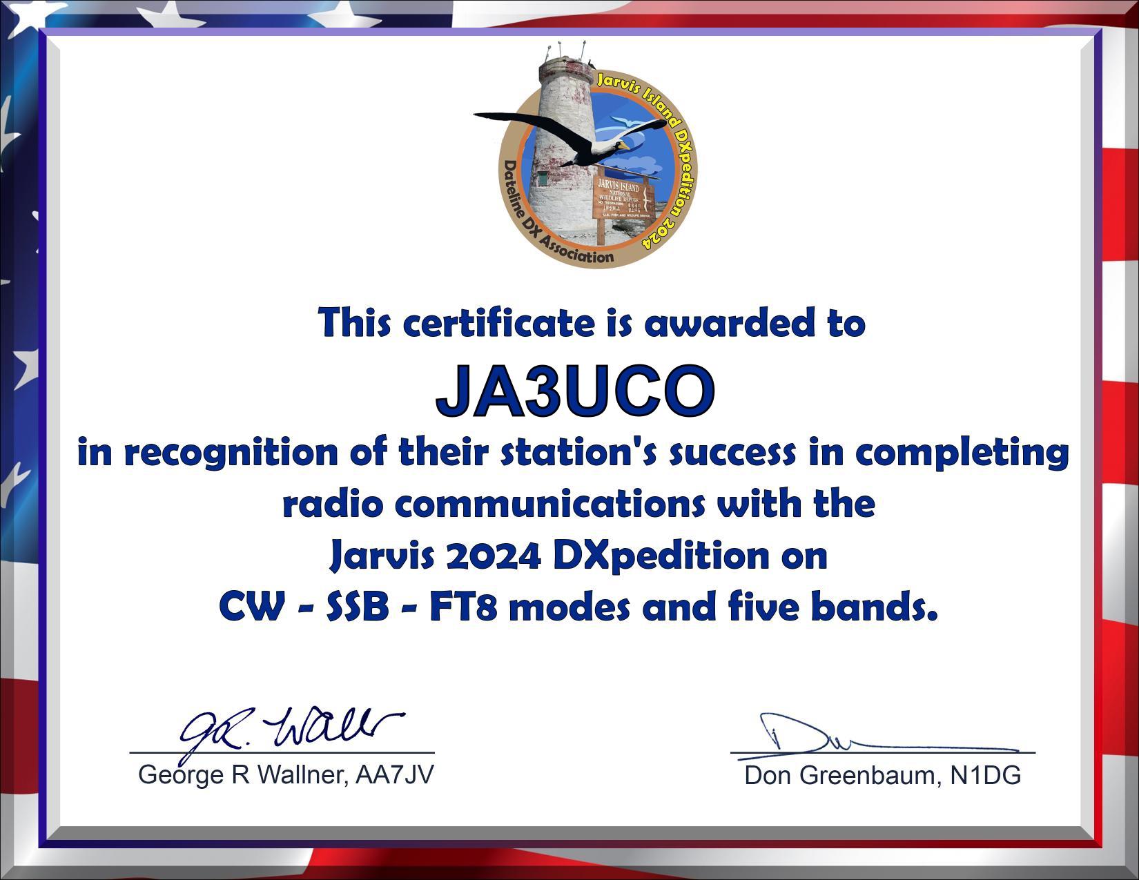 2024年8月に運用されました【 Jarvis Island N5J DXpedition.】でCW/SSB/FT8 3MODEで5BAND 以上QSOをしたDONATERに