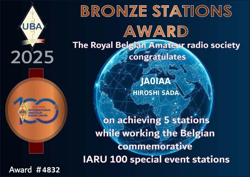 プリフィクスがON100、OO100・・・、OT100の局、およびOQ0IARU・OR0IARUとQSOするとアワードがネットで入手出来ます。