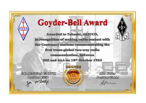 獲得すると【Goyder-Bell Award】が発行されました。詳細は QRZ.com http://www.gb2nz.com/ から