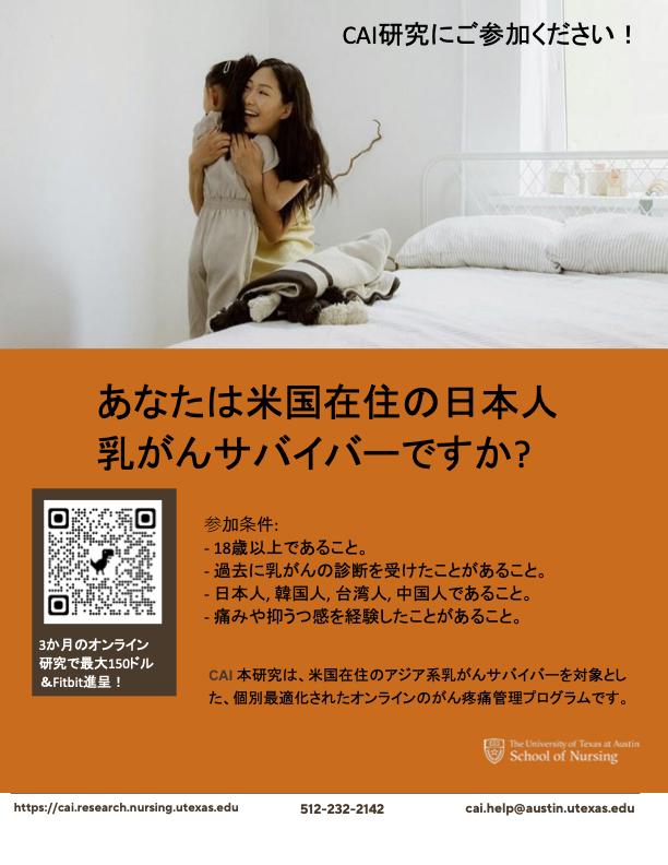 現在、アメリカにお住まいの日本人女性乳がんサバイバーの方々を対象に、痛みのセルフマネジメントに関するオンライン研究を行っており、参加者を募集しています。