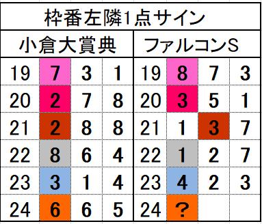 パッと見てわかる人は解るサインです。小倉大賞典を例にとるとサイン発信レース1着枠の左隣(+1)が各当レースにて連対圏内(1~2着)です。