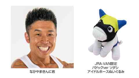 なかやまきんに君と写るJRA VAN限定のソダシのヌイグルミ