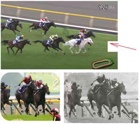 バックに映る大欅、西側ではなく東側のターフビジョン、右下のコースのマーク位置、ラチの脚(控えの角度)から、二人の騎手の鞭。