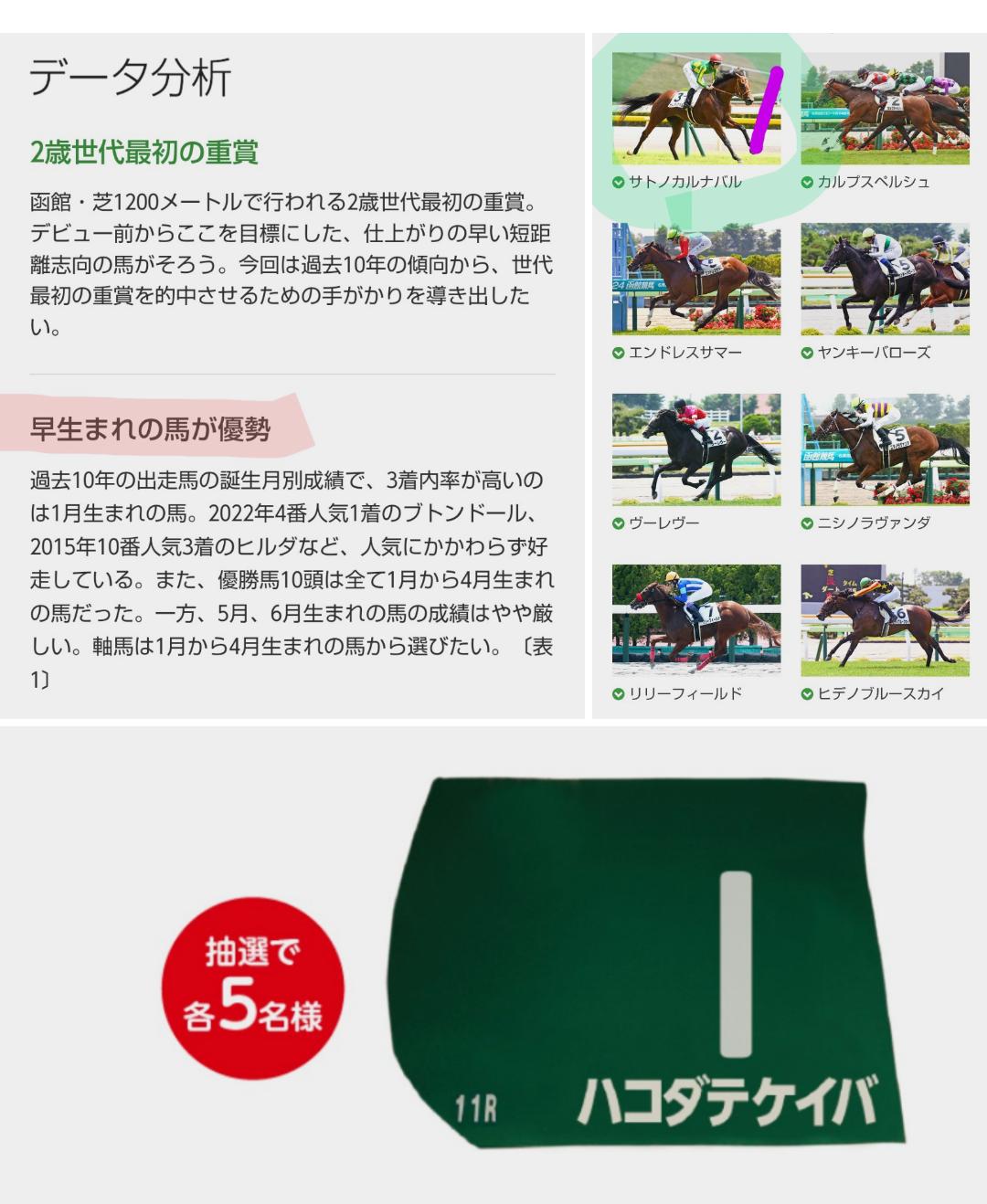 こんにちは、本日出走馬の表示ですので、出走情報とデータ文章から、(文面省略)函館2歳S、はたして、右の馬なのか、1を指すのか。