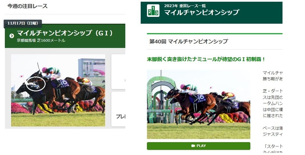 今週の注目レースと去年のGI マイルチャンピオンシップの成績ページ。