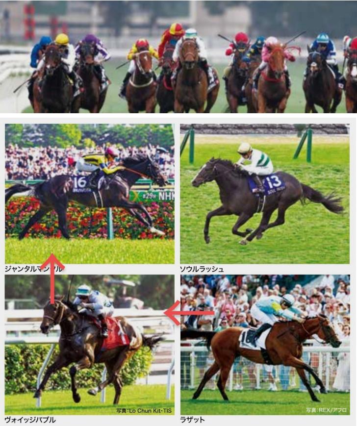 そして、ジャンタルマンタルとソウルラッシュが向かう という構図。『日本馬の足跡』には③アドマイヤマーズ。最後のページには同じ様な勝負服⑭ディヴィーナ