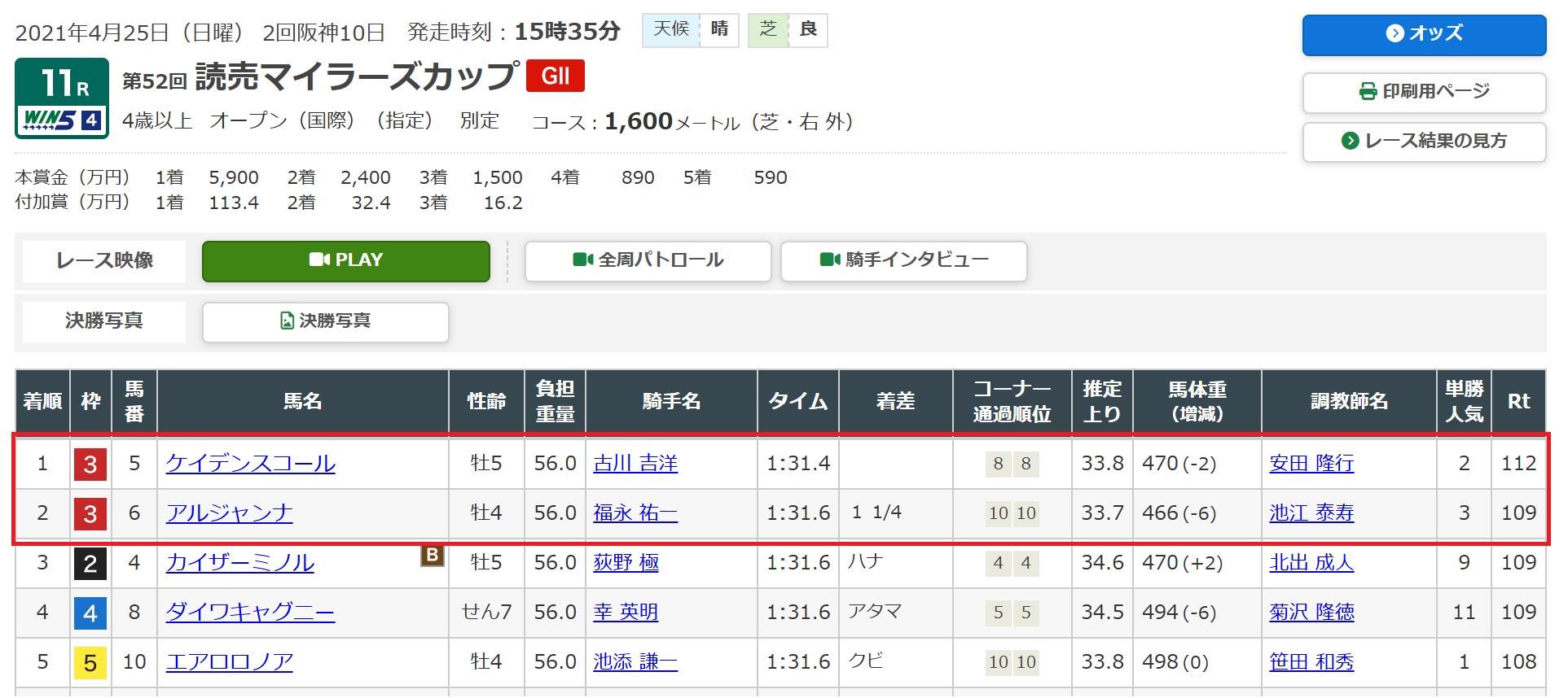 チャンピオンC:4枠2着、 松山6枠