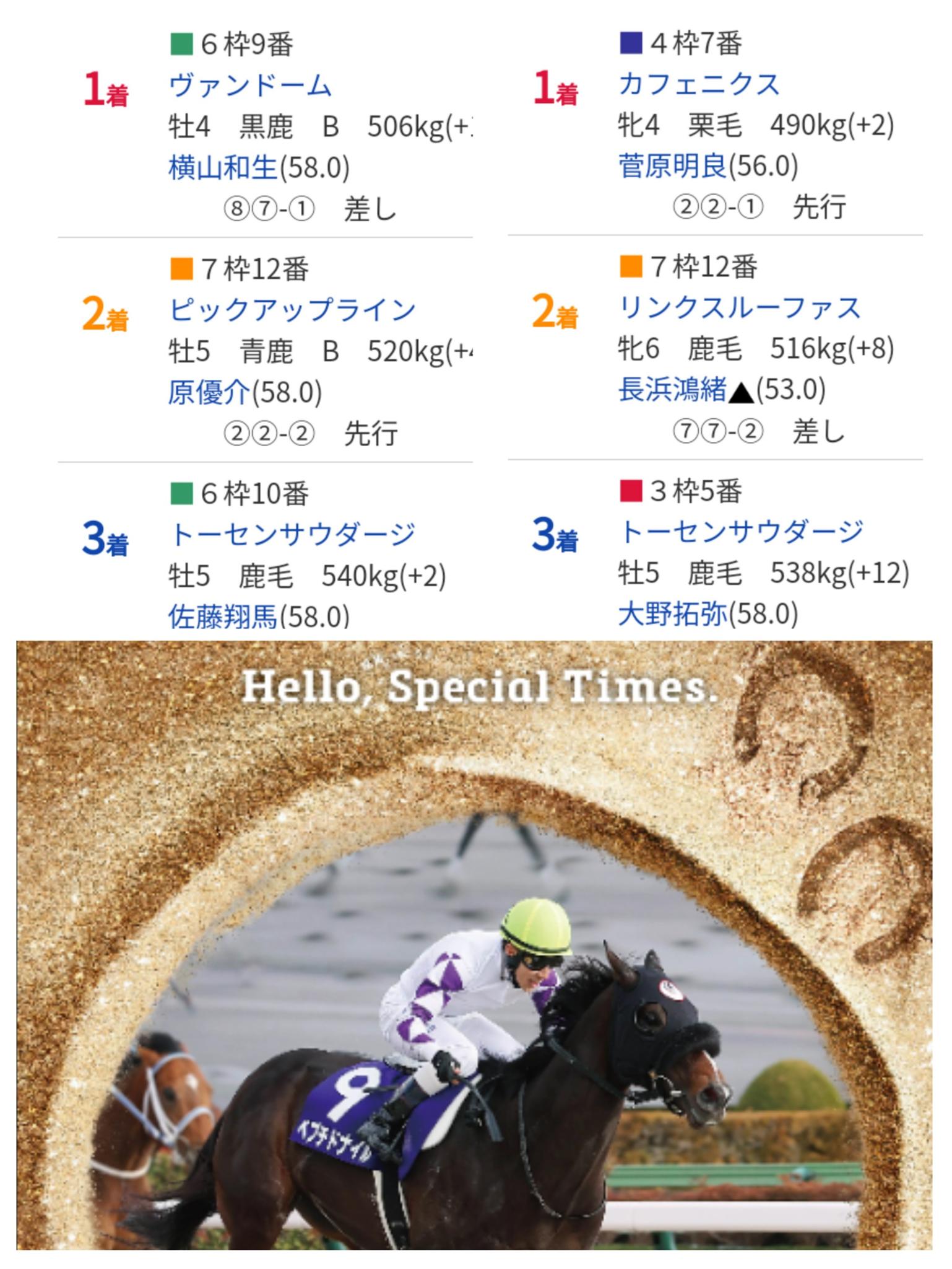 最終レースの「トーセンサウダージ」という馬。この馬前週も出走して3着。2着はどちらも