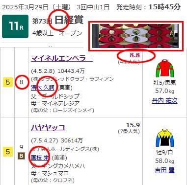 5枠。マイネルエンペラーとハヤヤッコ。フジテレビの【⑧番、8.8倍】。