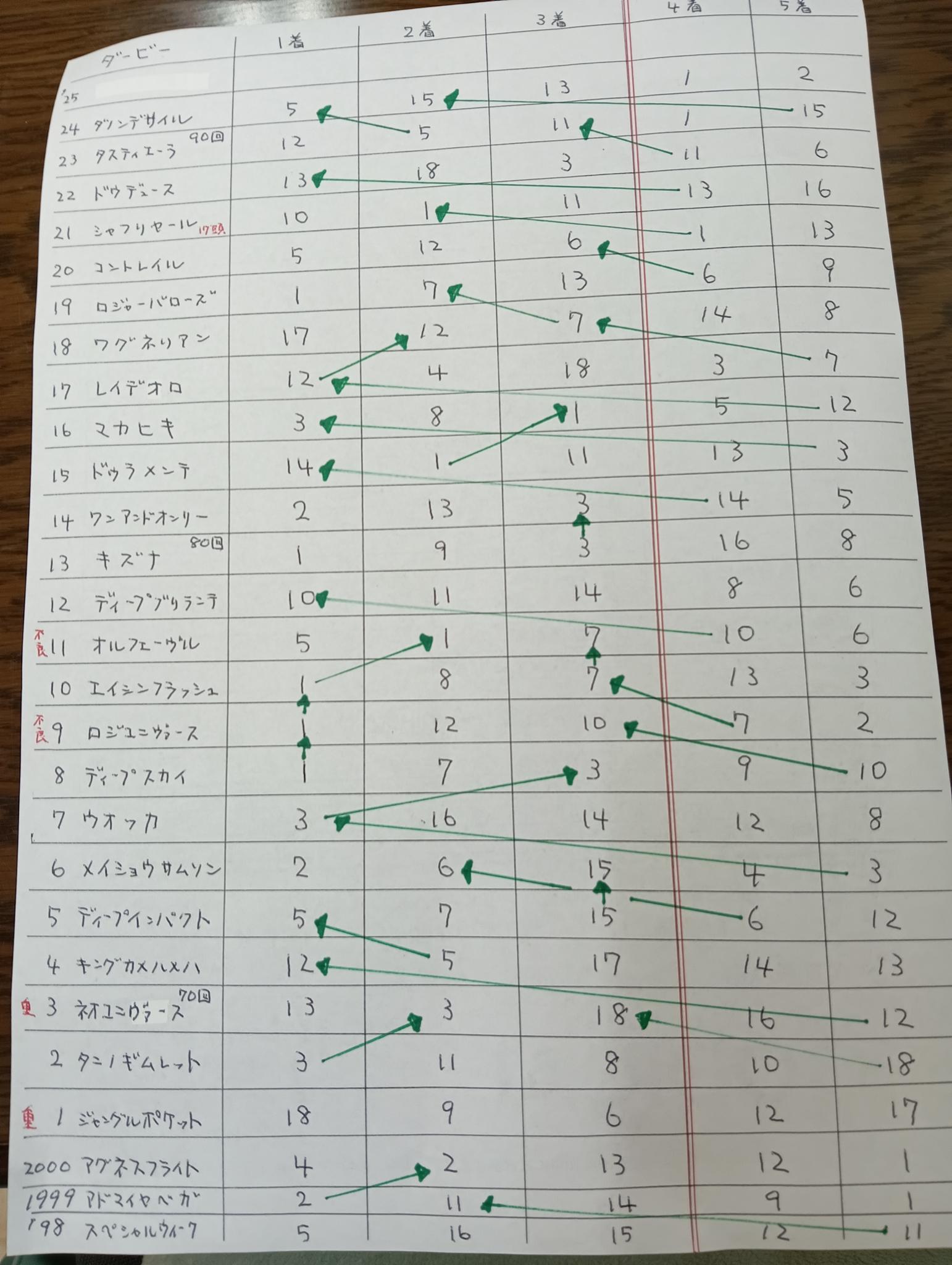 他に⑤1着の次の年は❿のパターンのみ。 メイショウサムソンを使ったきたと言う事で❷優勝と妄想しています(笑) 後、抽選であがってくるアシスト役LDH リラ・ドラゴン・ホウオウ+ユニバース(宇宙)に期待します。 手書きですが5着までまとめたものアップしておきます。