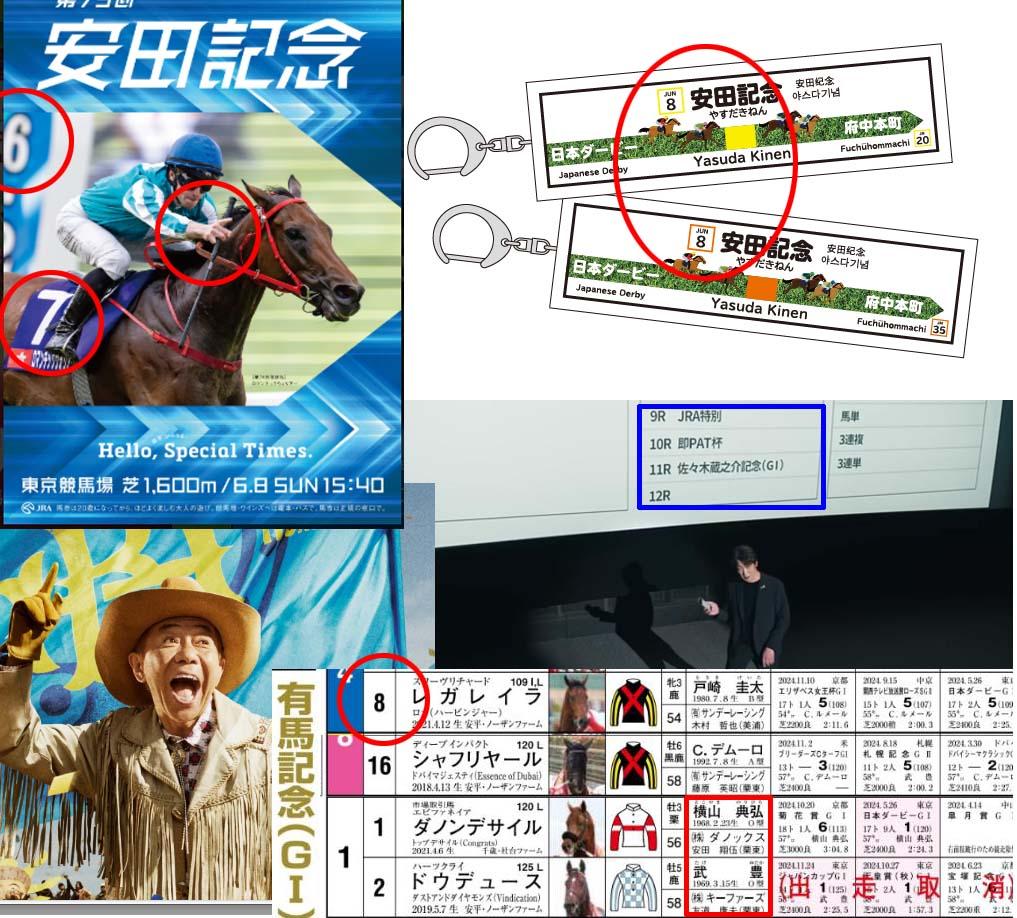 安田記念のポスターの【6】【⑦】【指→】。そして【キーホルダーの⑧】。