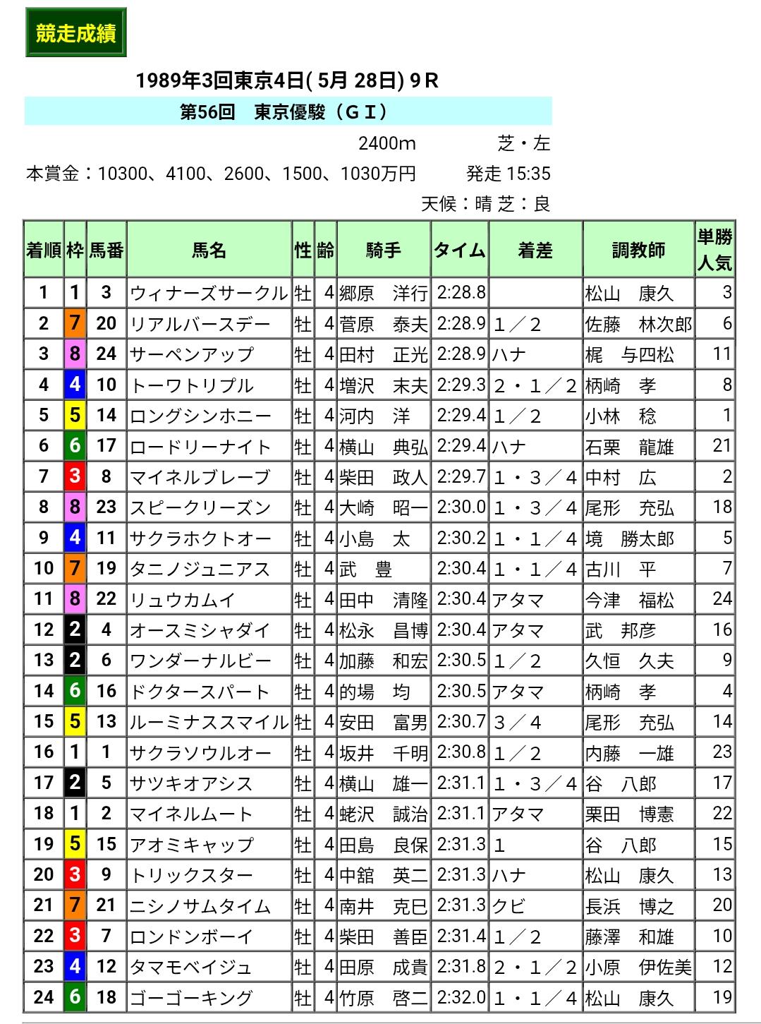 キムラハヤオ様のX「長嶋さんとジェンティルドンナ、天皇陛下とワンアンドオンリーの誕生日」の話を拝見し思い出した【1989年日本ダービー】。