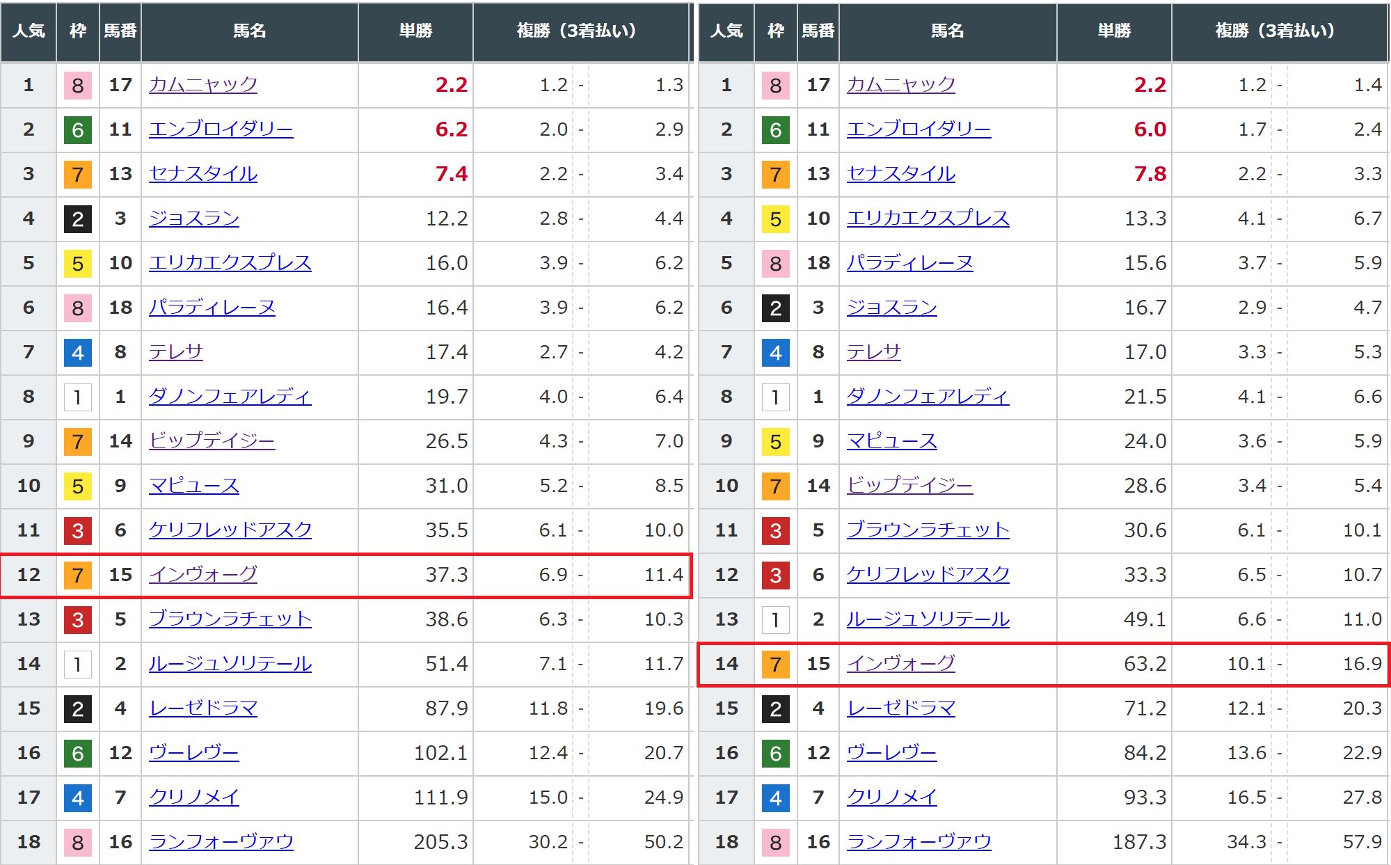 菜:インヴォーグの単勝オッズ