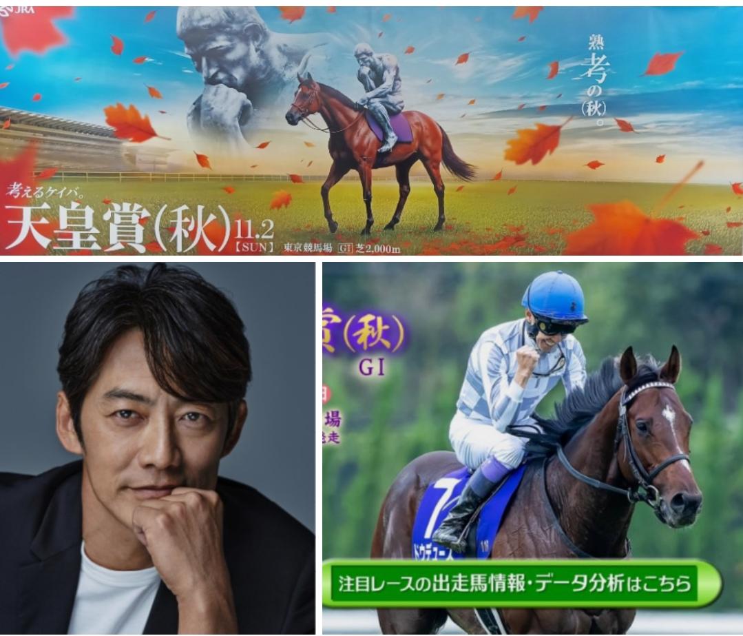 中吊り広告の【右手のグー】。これが武豊騎手の【右手のガッツポーズ】なら、CMの【イェーのポーズ(チョキ?)】が気になりますね。