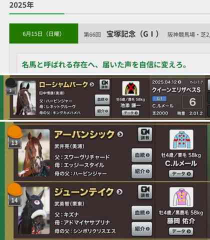 こんばんは、春のG1シリーズも最後の宝塚記念。