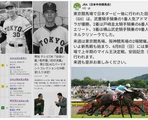 目黒記念から安田記念の8枠をFacebookが示し、目黒、江川、小林というキーワードで【黄桜】のCMを示す。
