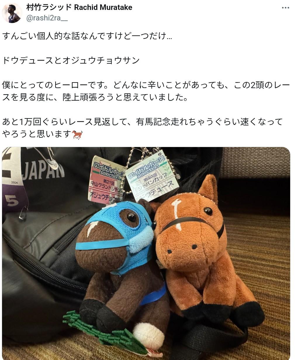 村竹ラシッド選手の『X』に「ドウデュース」「オジュウチョウサン」「有馬記念」。